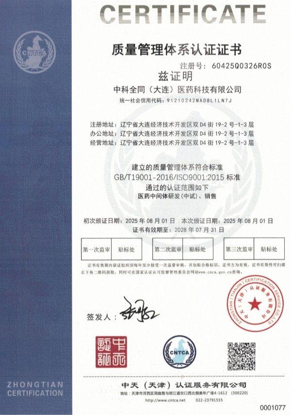 最近,中科全同(大连)医药科技有限公司有个好消息——公司顺利通过了ISO9001质量管理体系认证。这意味着在质量管理上,公司已经达到了国际标准,也为今后的发展添了把劲。